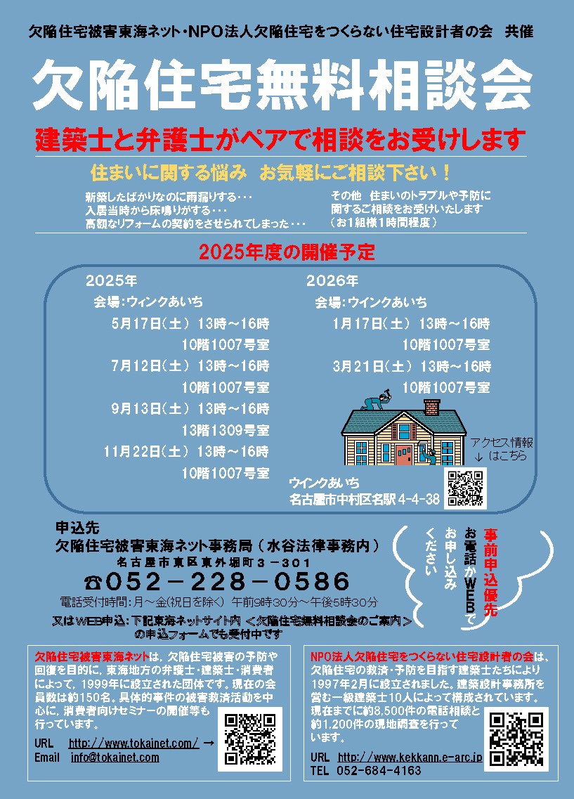 以下の日程で、欠陥住宅無料相談会を開催いたします。